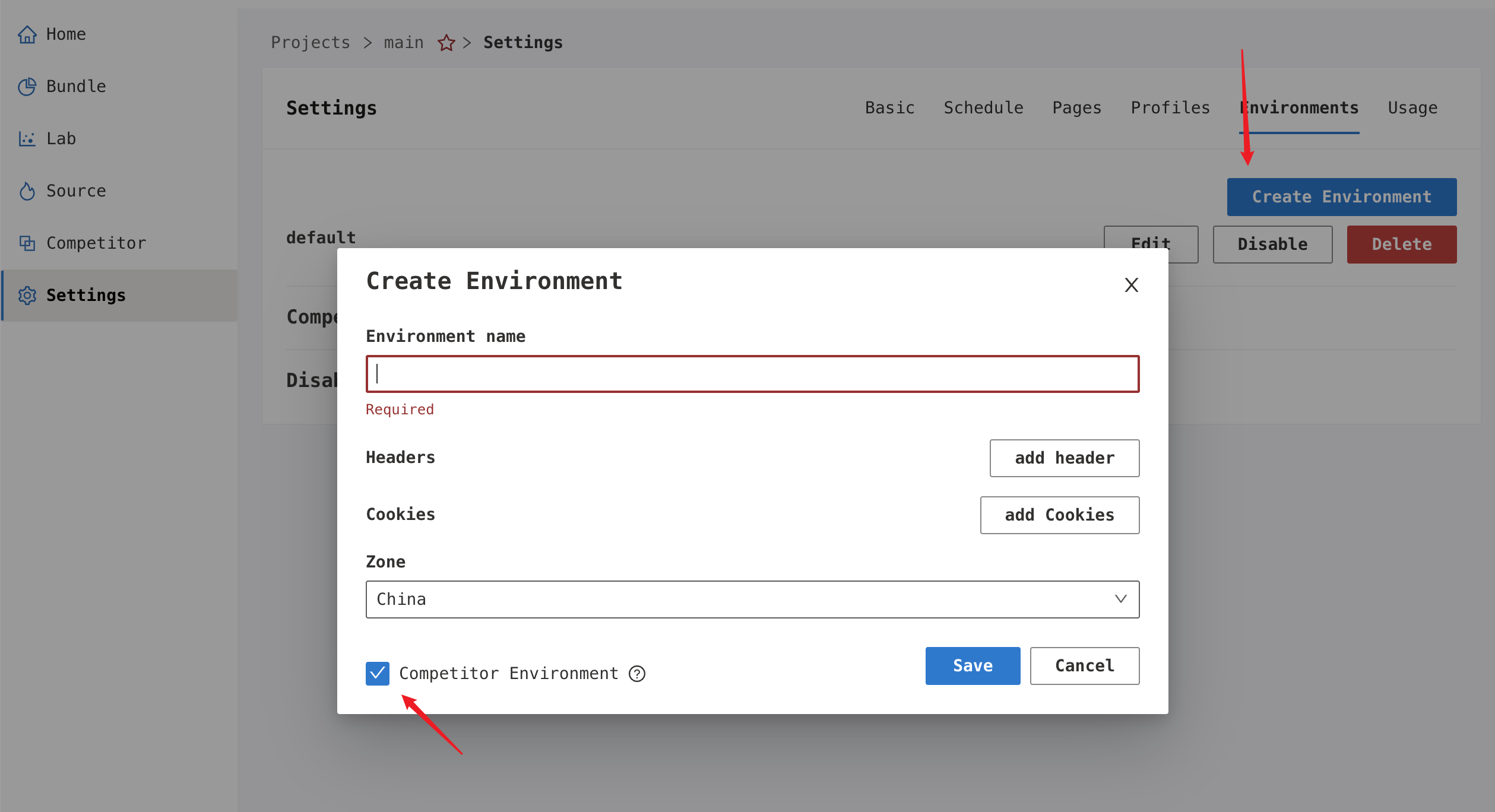 点击右上角 Create environment 按钮,勾选 checkbox 表示创建的是一个竞品环境。竞品环境用于给竞品页面和临时页面提供需要的 cookies 和 headers。